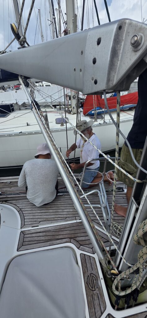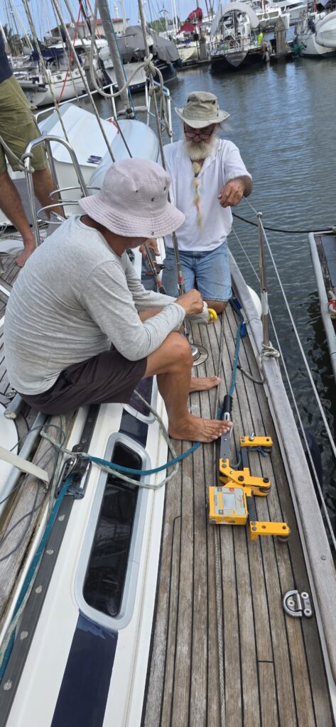 Ach ja, es ging nicht in zweimal 30 Minuten, es hat 4 Stunden gedauert, weil dann doch das ganze Rigg neu eingestellt werden musste – Flüche schallten durch die Marina – Alle – LAUT!