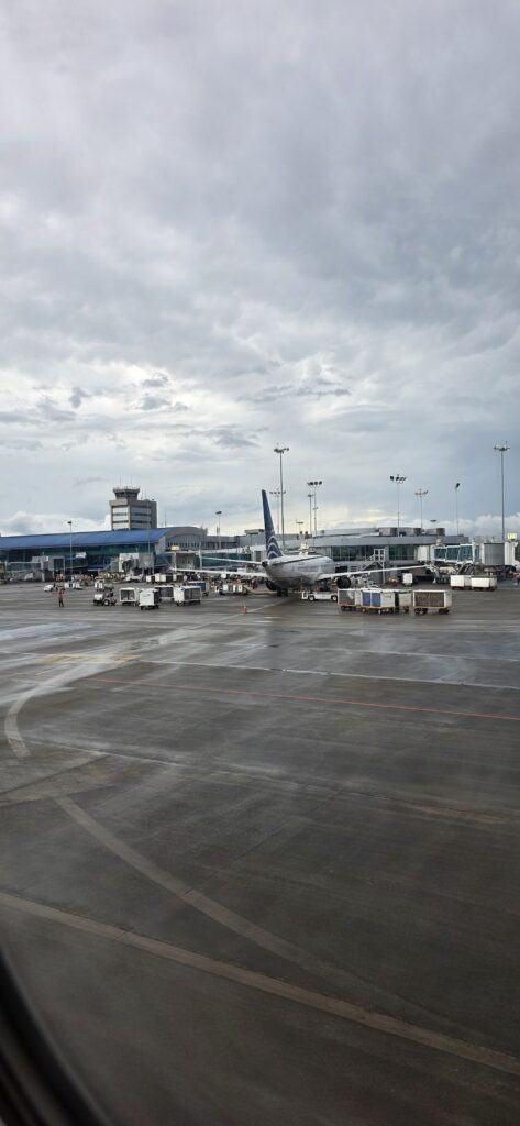 Übergepäck, weil viele Neu- und Ersatzteile dabei. Aber alles problemlos und den großen Koffer haben wir hier gegen Bier abgegebenIch fand, dass der andere Flieger sehr nah neben uns flogNach 12 Stunden Flug in Panama City gelandet