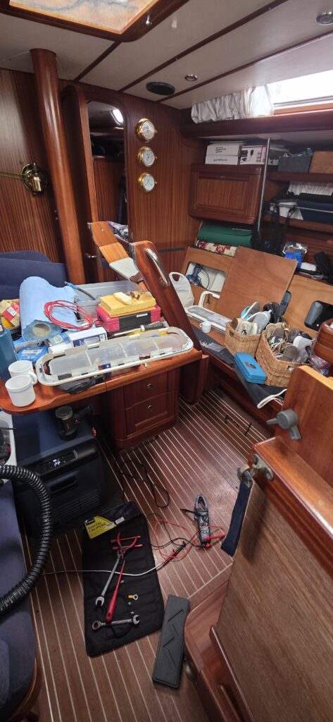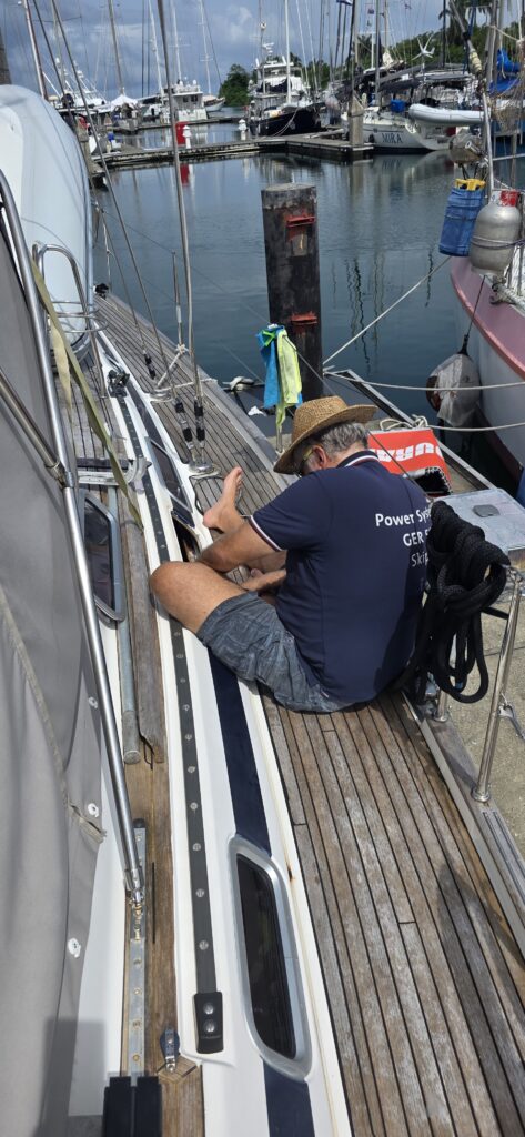 An allen Orten wird gearbeitetMal auch bei Freunden an Bordund so ist es aus, wenn gearbeitet wirdUmbau der Verkabelung und Einbau Lichtmaschinedauertaber mit Hilfe von anderen Seglern (Danke Hartmut) gelang es schließlichAustausch der Luken – mehrfach