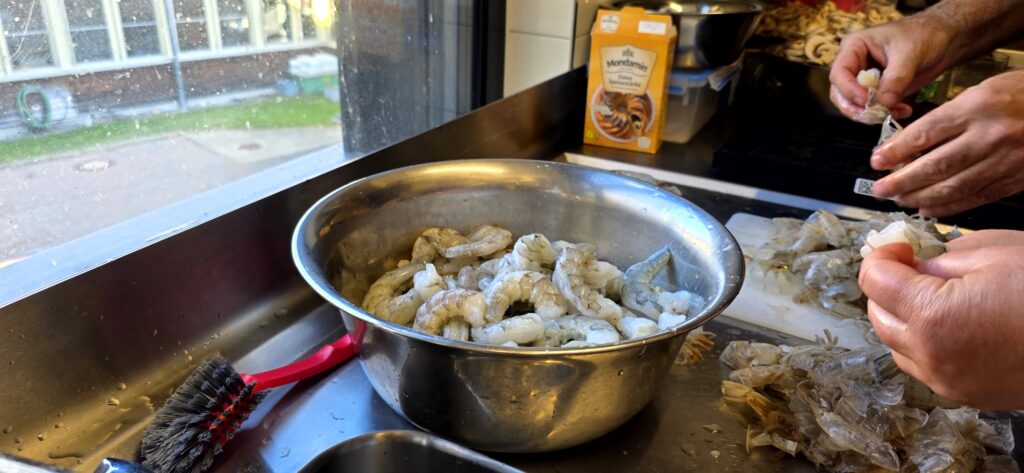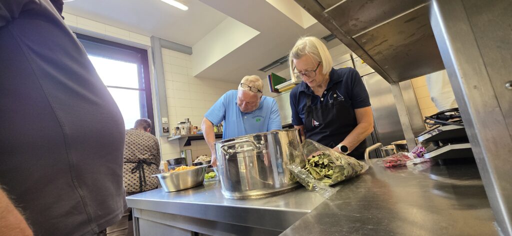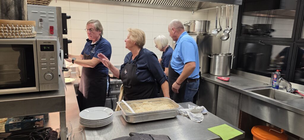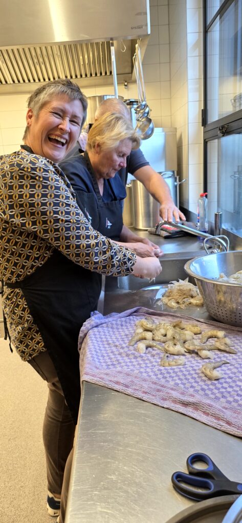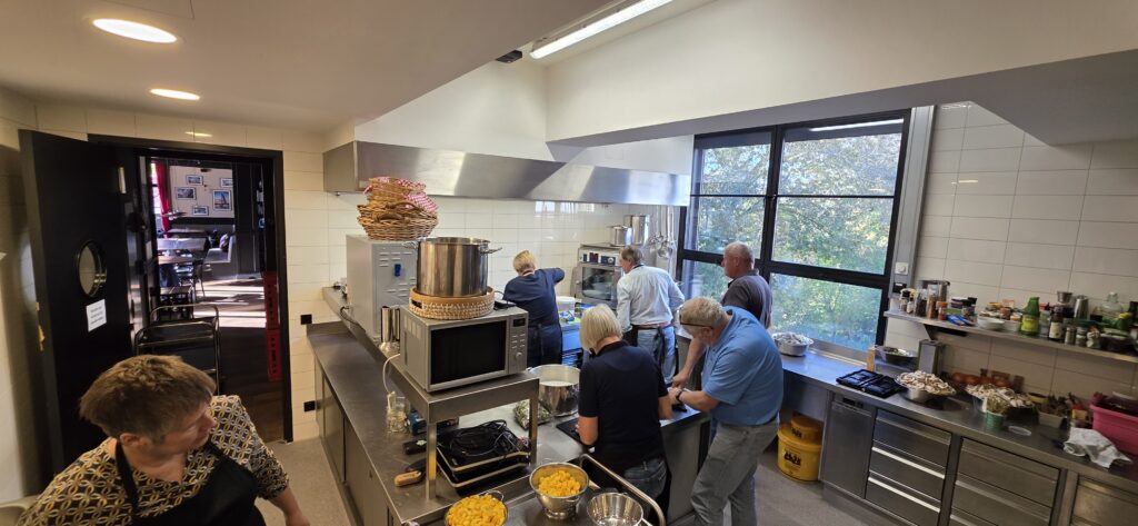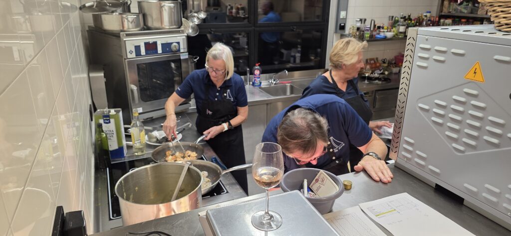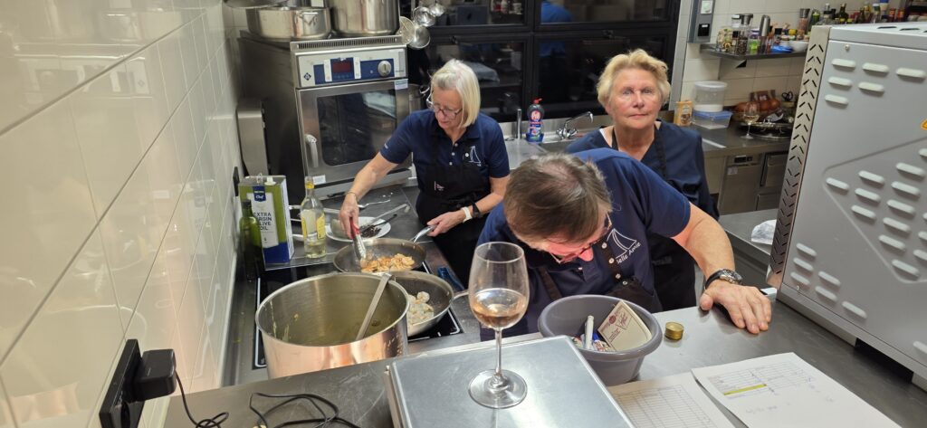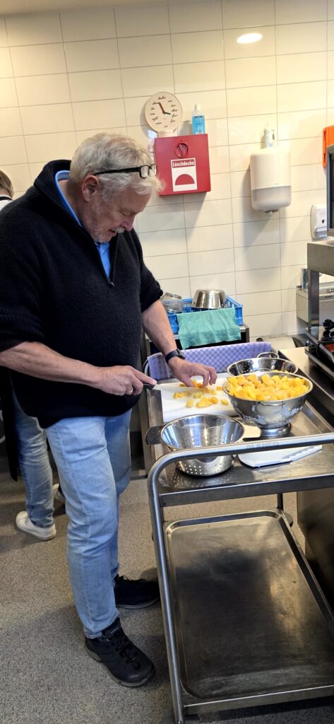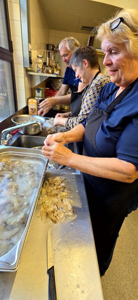 Los ging es mit der Vorbereitung in der Profiküche für ein Curry mit Garnelen – da kommt ganz schön was zusammen für die Menge Menschen, wir hatten aber professionelle Unterstützung von Regine und Manfred. So hat alles perfekt funktioniert und das Essen konnte pünktlich und heiß serviert werden.