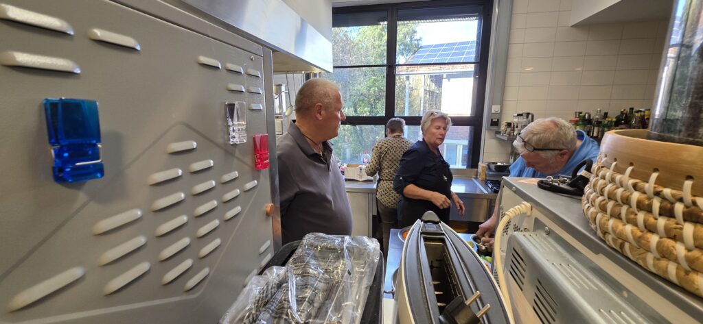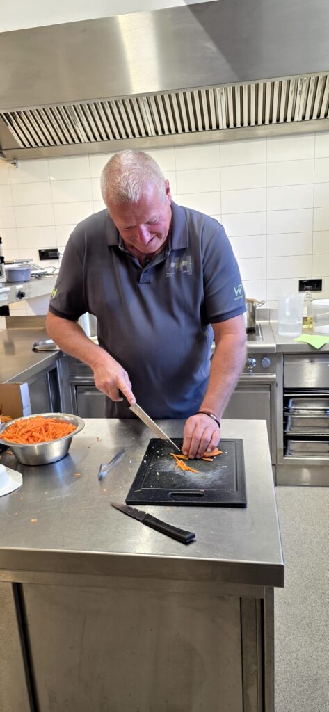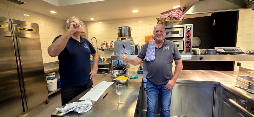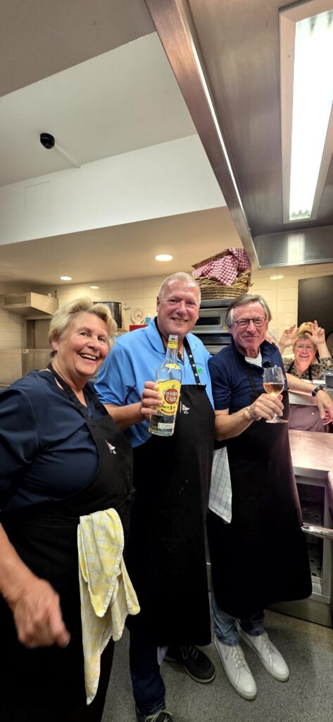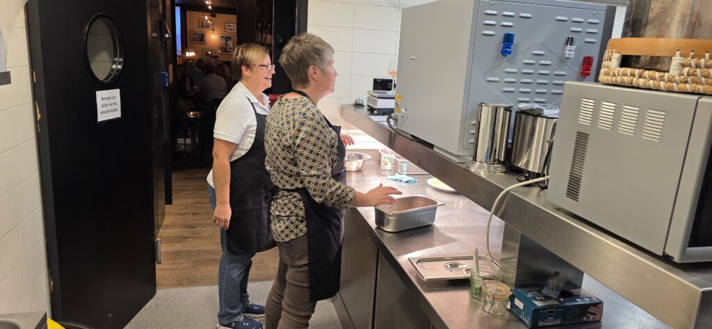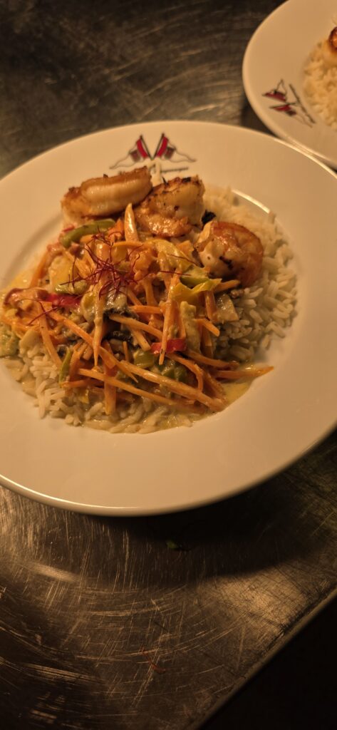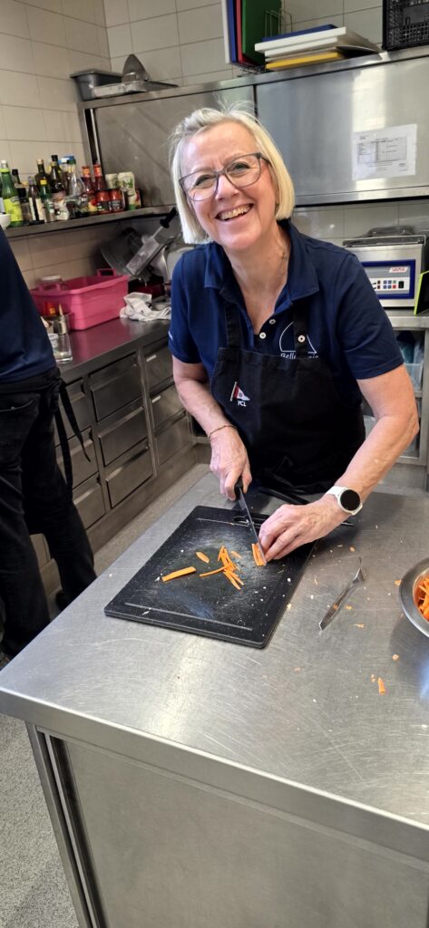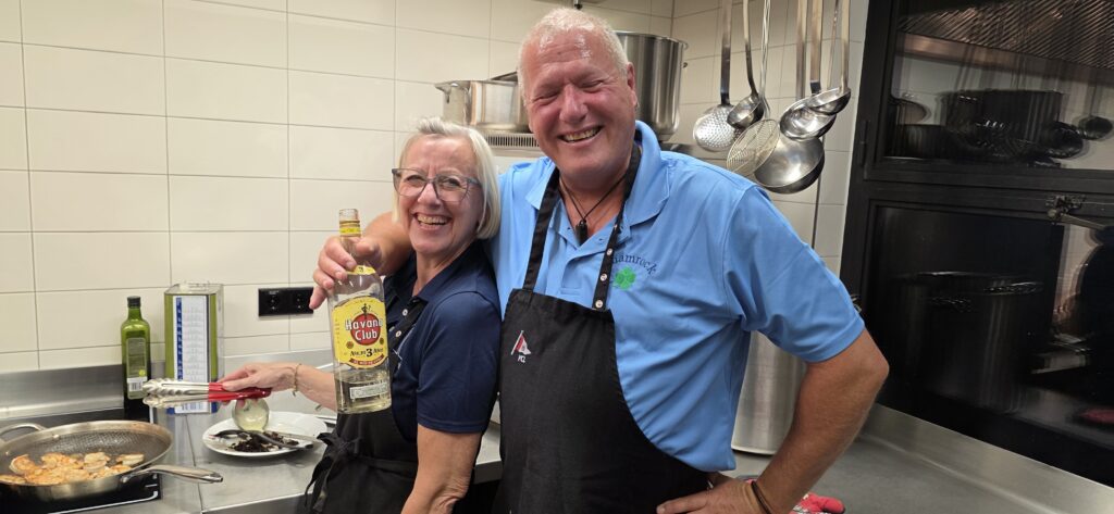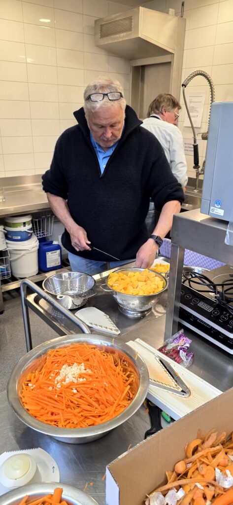 Los ging es mit der Vorbereitung in der Profiküche für ein Curry mit Garnelen – da kommt ganz schön was zusammen für die Menge Menschen, wir hatten aber professionelle Unterstützung von Regine und Manfred. So hat alles perfekt funktioniert und das Essen konnte pünktlich und heiß serviert werden.